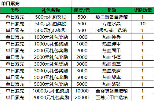 2.根据玩家前一日累计充值金额,可以在对应的累充档位里自选一档礼包进行发放